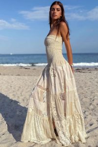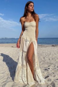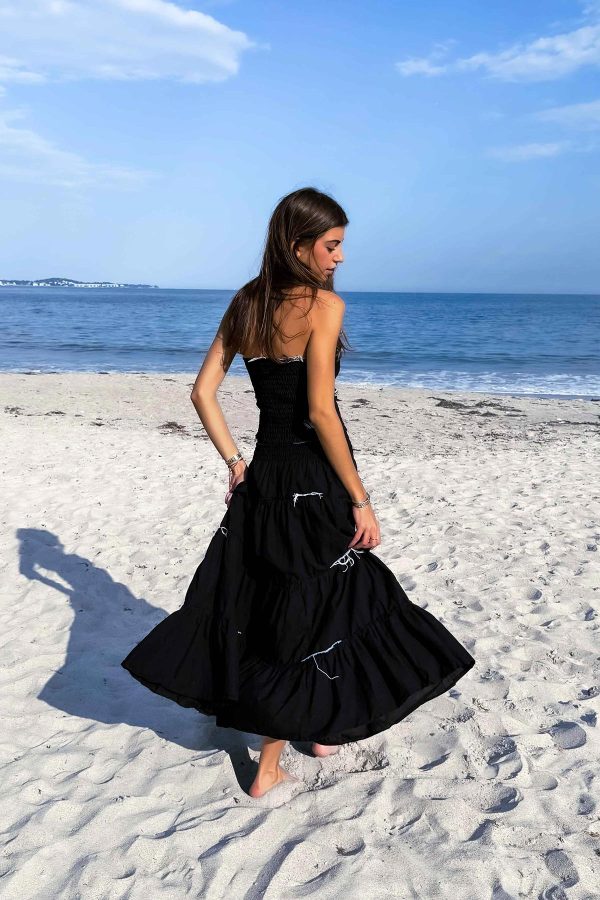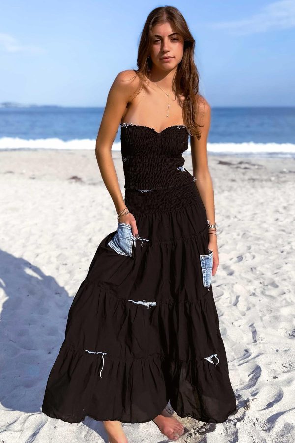 Hand made in France 100% cotton and silk patchwork. This strapless silhouette features smocked bodice and airy lace panels, blending ease with elegance. A versatile piece that transitions effortlessly from beach to dinner.