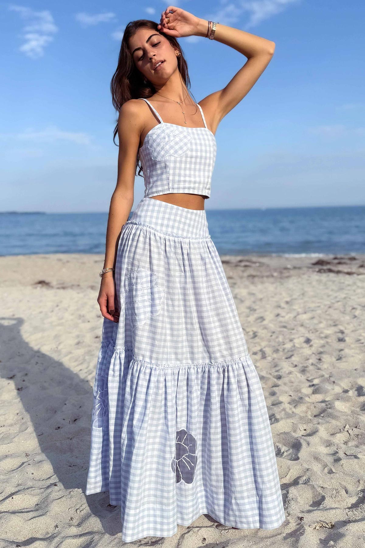 Fresh and classic, this gingham two-piece features a cropped top and tiered maxi skirt with delicate cutout embroidery.