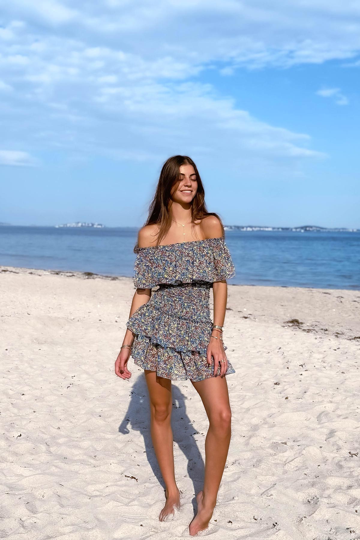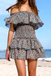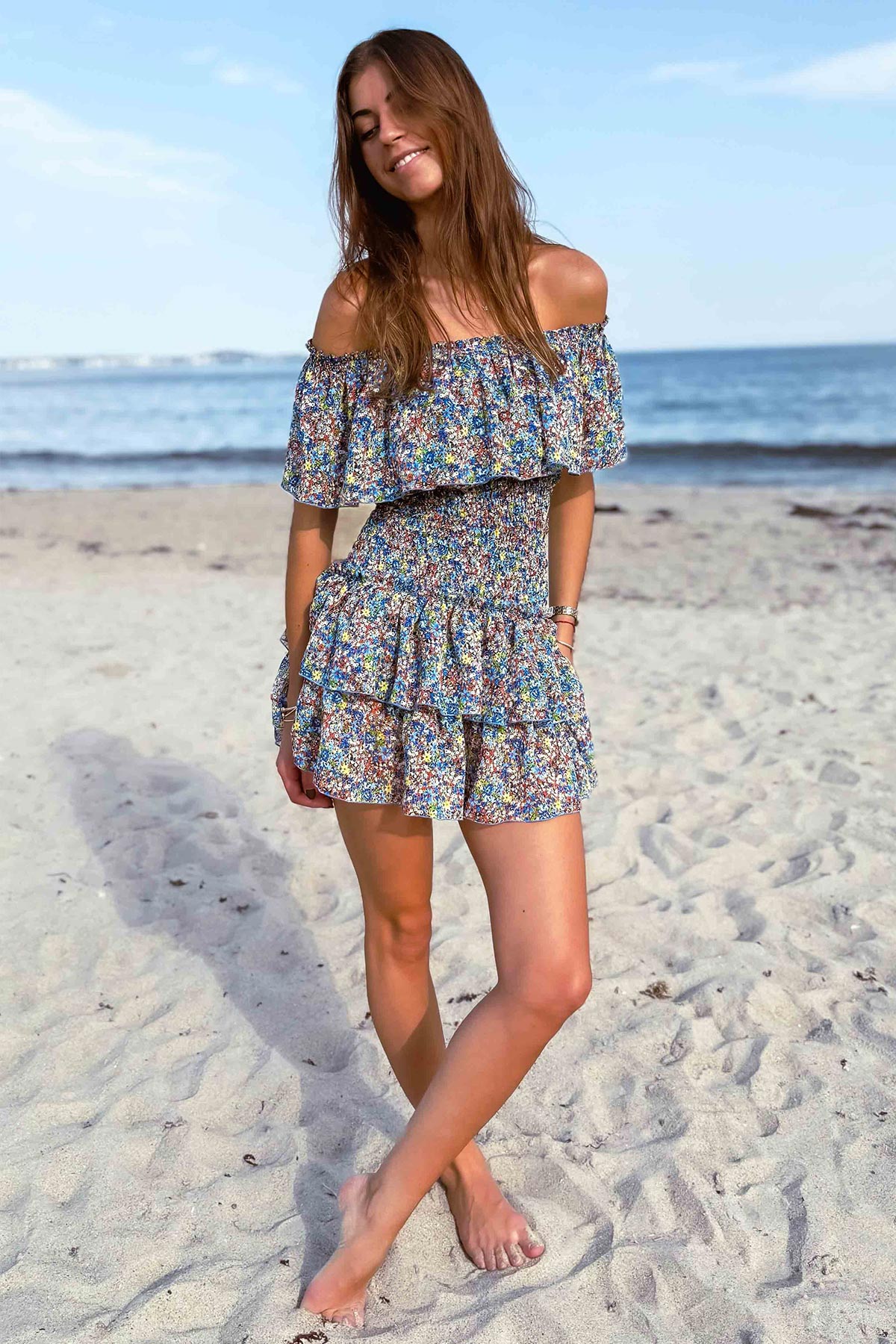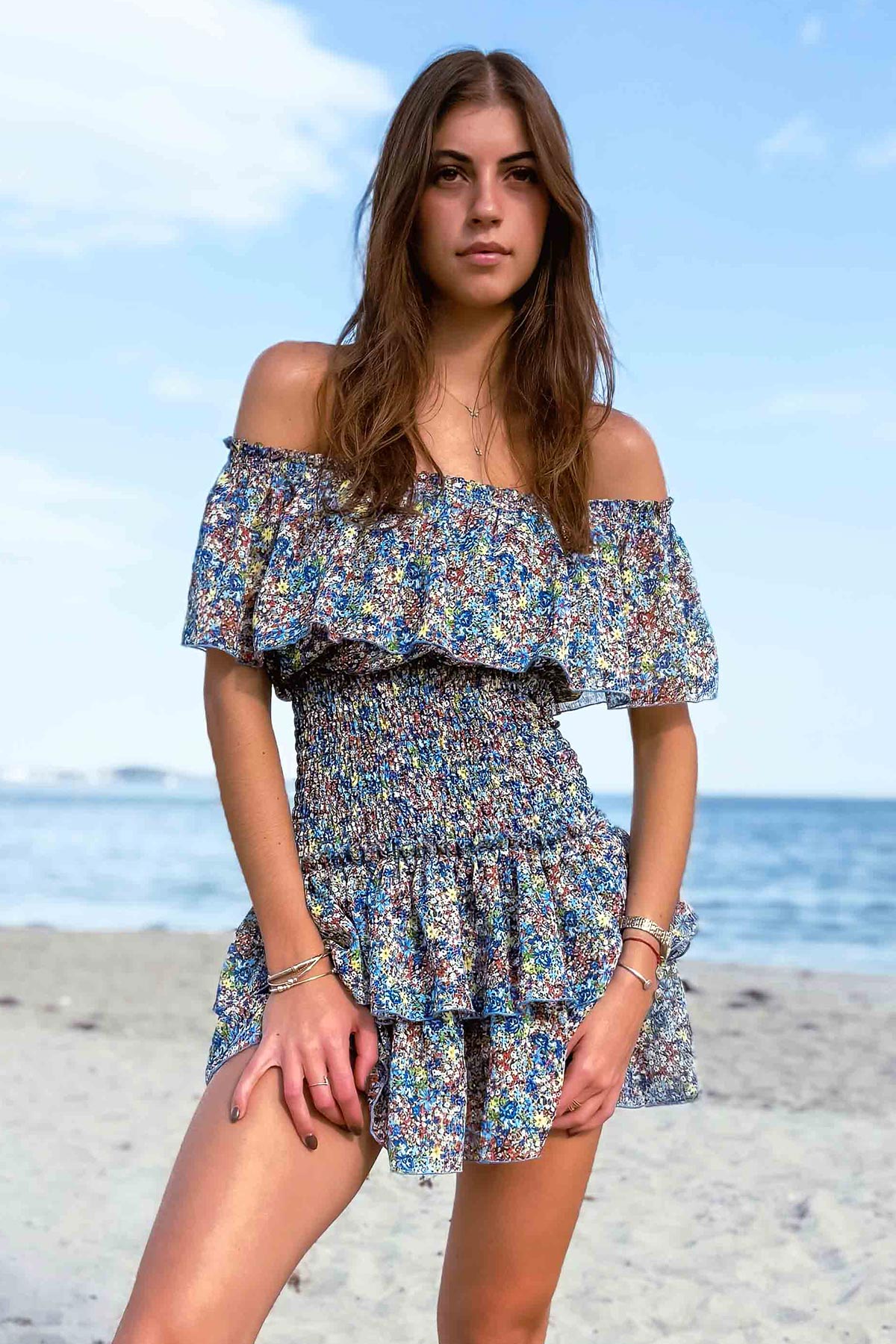 Hand made in France 100% mousseline.Flirty and fun, this off-shoulder, one shoulder or square neck mini features a smocked bodice and tiered ruffle skirt with versatility.