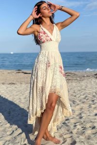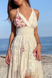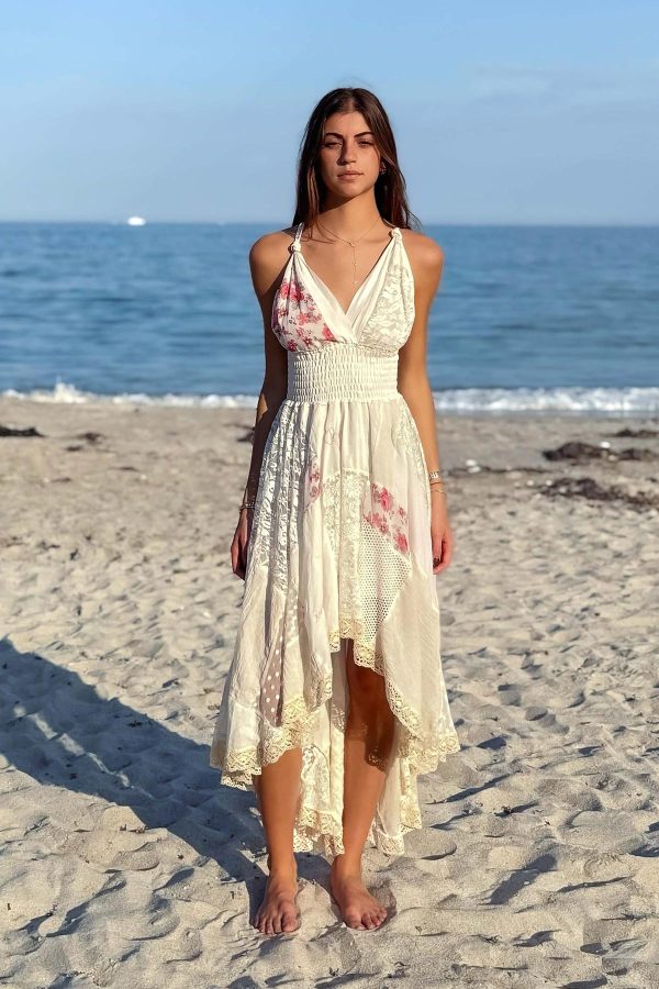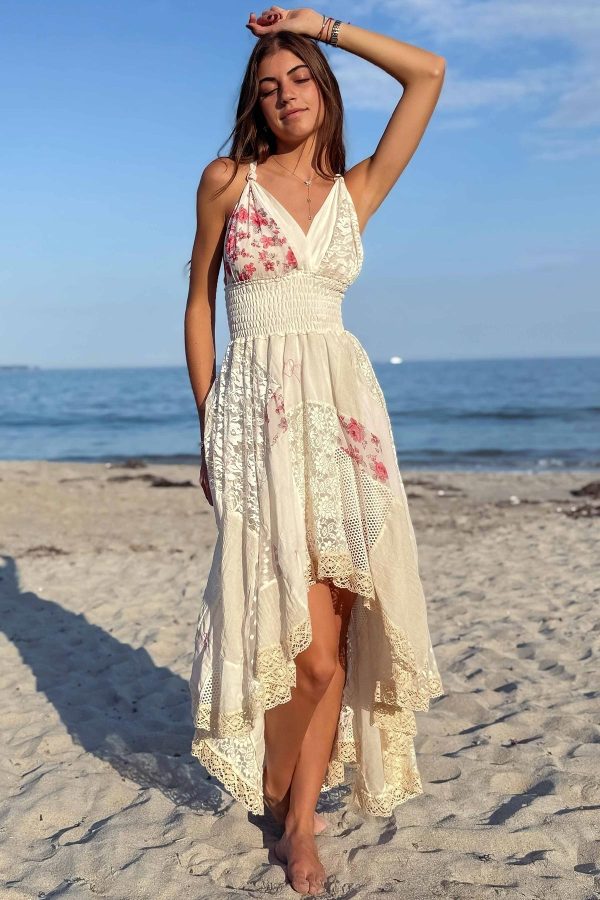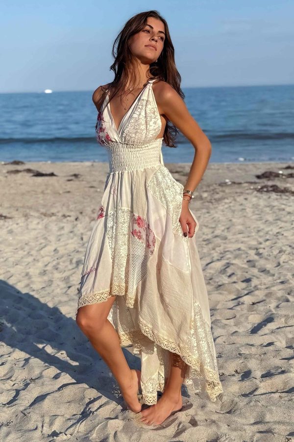 Hand made in France 100% silk patches.Romantic and effortless, this flowing dress combines delicate lace with floral accents. A timeless bohemian silhouette that moves with the sea breeze. Versatile ways to tie and cinch the top and bust.