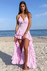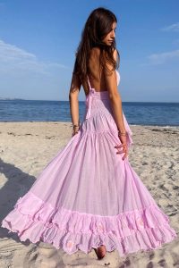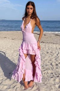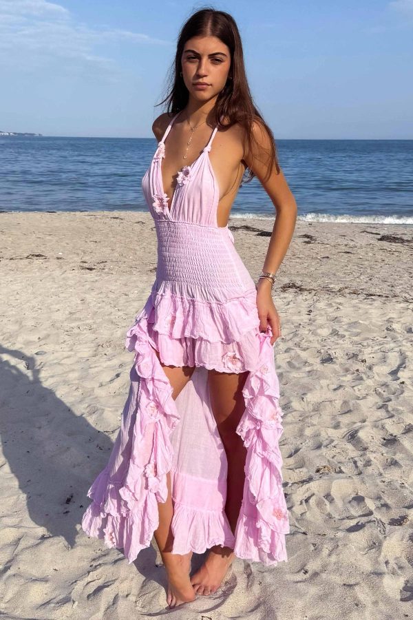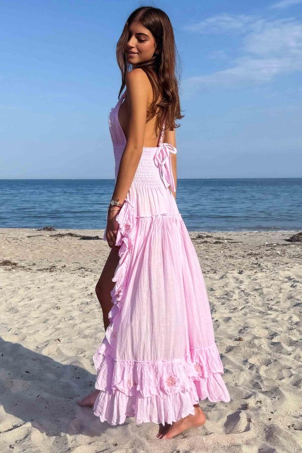 Hand made in France 100% cotton gauze. A dreamy halter maxi with smocked waist and high low cascading ruffles. Feminine, flattering, and designed to twirl with every step.