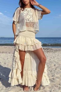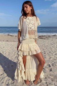 A breezy two-piece set crafted from intricate patchwork lace and airy cotton panels. The relaxed short-sleeve top features delicate crochet and lace detailing, while the high low ruffled skirt is finished with embroidery, giving it effortless movement. Romantic yet modern, it’s perfect for sunny days.