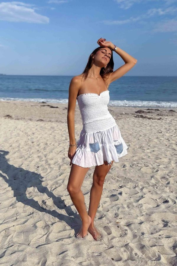 A short cotton mini skirt accented with denim pockets and distressed details. Hand-made in France, it brings a casual, youthful edge to summer looks.