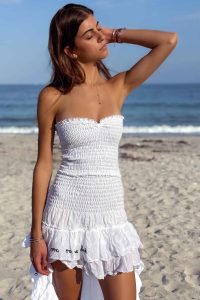 A strapless smocked top in 100% cotton, made in France. Its playful stretch fit and textured ruching make it versatile — pair it with skirts, shorts, or denim for an easy summer look.