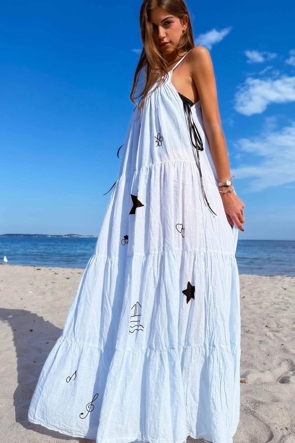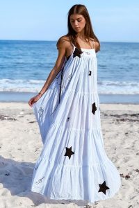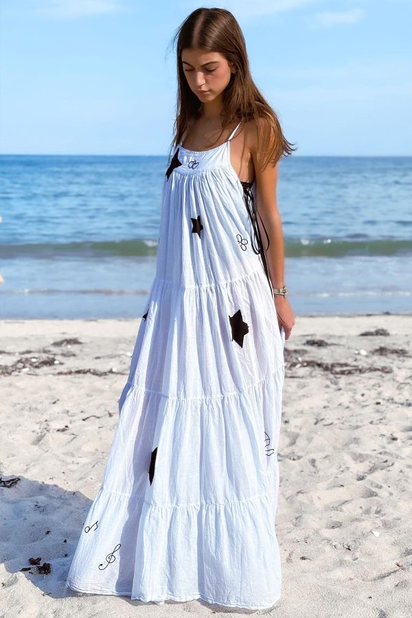 A celestial-inspired maxi, adorned with bold black stars and embroidery.